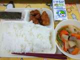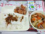 鶏肉のたつたあげ あつあげと野菜の煮もの おかかなっ葉 ご飯 牛乳