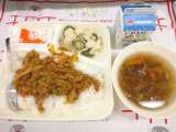 豚肉のねぎじょうゆ焼き ふきよせ煮 ツナ大豆そぼろ" ご飯 牛乳