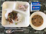 ピリ辛丼、中華スープ、黄桃(缶)、ごはん、牛乳