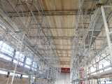講堂天井の工事が始まりました。 足場が組まれ、天井全面に仮天井が張られています...