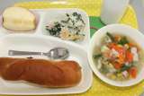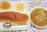 鶏肉と野菜のスープ煮 ほうれん草のグラタン りんご ぶどうパン 牛乳