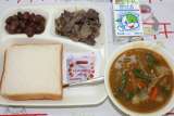 牛肉の香味焼き 豚肉とだいこんのカレー煮 うずら豆のグラッセ 食パン い...