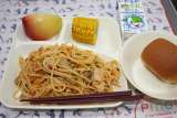 チキントマトスパゲッティ 焼きとうもろこし りんご 黒糖パン 1/2 牛...