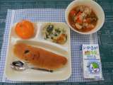 豚肉と野菜のスープ煮 変わりピザ 白桃(缶) 黒糖パン 牛乳