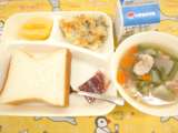 ツナポテトオムレツ スープ きゅうりのバジル風味サラダ 黒糖パン 牛乳