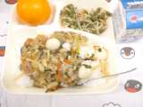 スープ煮 ほうれんそうのグラタン 白桃(缶) いちごジャム" 牛乳