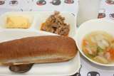 とうふハンバーグ スープ煮 固形チーズ レーズンパン 牛乳