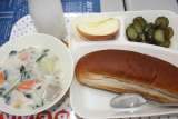 ほたて貝のクリームシチュー きゅうりのピクルス りんご 黒糖パン 牛乳