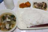 鶏肉の甘辛焼き さつまいものみそ汁 きくなとはくさいのごまあえ ごはん ...
