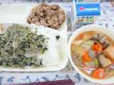 じゃこ菜っ葉ごはん 豚肉のスタミナ焼き あつあげと冬野菜のあったか煮 ご飯 牛乳...