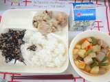 鶏肉のゆず塩焼き 含め煮 魚ひじきそぼろ ご飯 牛乳