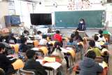 突然の雪で、運動場がわずかに白くなりました。休み時間になると、子どもたちは教室...