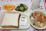 "豚肉ととうふのうま煮 きゅうりの中華あえ デコポン 食パン バター ...