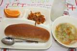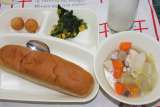 鶏肉と野菜のスープ煮 ほうれん草とコーンのソテー あげポテトもち 黒糖パン...