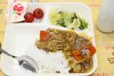 ポークカレーライス 金時豆と野菜のサラダ プチトマト ごはん 牛乳