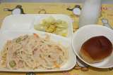 さけのクリームスパゲッティ キャベツとコーンのサラダ 黒糖パン 1/2 ...