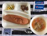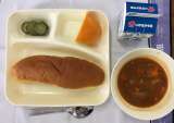 豚肉のデミグラスソース、スープ、キャベツとコーンのソティ、大型コッペパン、ブル...
