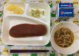 カレースープスパゲッティ、キャベツのピクルス、りんご(カット缶)、黒糖パン、牛...