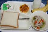 豚肉とキャベツのスープ煮 変わりピザ バナナ 食パン マーガリン 牛乳