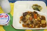 牛肉と大豆のカレーライス レタスのサラダ ヨーグルト ごはん 牛乳