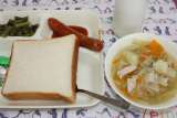 "ウインナーのケチャップソース スープ 三度豆のサラダ 食パン マーガリ...
