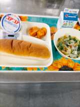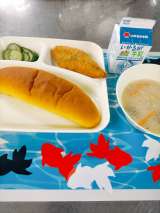 サーモンフライ 豆乳スープ きゅうりのバジル風味サラダ パンプキンパン 牛乳