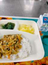 和風カレー丼 オクラのかつお梅風味 りんご(カット缶) 牛乳