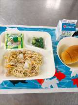 和風焼きそば オクラの甘酢あえ まっ茶大豆 黒糖ロールパン 牛乳