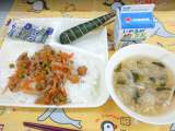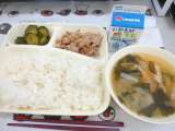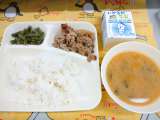 豚丼 すまし汁 いり黒豆 牛乳