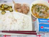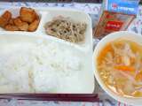 鶏肉のからあげ 中華みそスープ きゅうりとコーンの甘酢あえ ご飯 牛乳