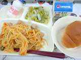 チキントマトスパゲッティ グリーンアスパラガスとキャベツのサラダ 発酵乳 黒糖パ...