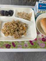 オイスターソース焼きそば もやしのしょうがづけ ぶどう ミニコッペパン 牛乳