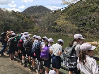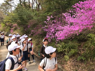 シンボルゾーンからは、登った甲山を見ることができ、「あんな高いところまで、登ったんだ」と話す子どもたちでした。山頂や広場では、鬼ごっこをして遊ぶほど、まだまだ元気いっぱいの子どもたちでした。コバノミツバツツジやオオイヌノフグリ、池の魚を観察しながら、無事帰校しました。自然を満喫した1日となりました。