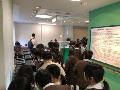 昼食を終え、昆虫館の見学をしています。珍しいチョウやカマキリなどの昆虫に、子どもたちは興味津々です。