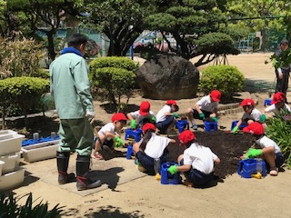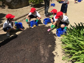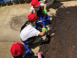 1年生がアサガオの種植えをする時期を迎えました。管理作業員さんにも教えてもらいながら、土をふんわりいれて、植木鉢のふかふかベットを作っています。夏にはきれいなアサガオが咲きますように。