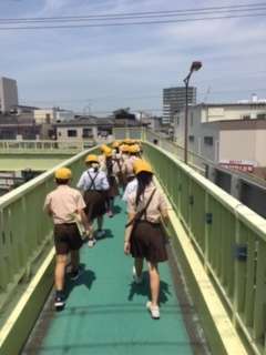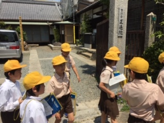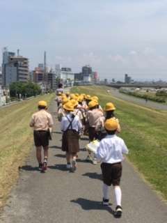 いいお天気のもと、探検バックに地図をはさみ、筆記用具を入れて、いざ出発。バス通りまで出た後、バス停を確認して、どんぐり公園の横を通過。歩道橋の手前の、少し道を入ったところで地図の確認と記号の記入。その後、歩道橋を渡り、ライフの横を通り2つ目の角を左折して直進すると木川幼稚園に到着。再度記入し、金光教→正通院→淀川の堤防の上を歩いて学校へ到着。40分ほどの道々。理科で学習した花を見つけたり、道路標識について考えたりと、今まで気づかなかったことに気づきつつ、地図の見方にも少し慣れた3年生でした。