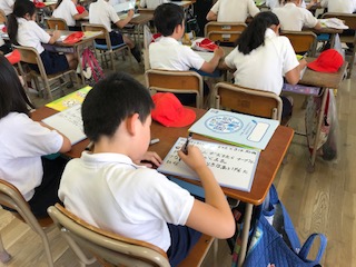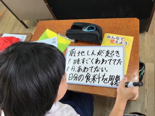 ホワイトボードに思いや考えをまとめ、交流しました。短時間の学習、ホワイトボードを有効活用できました。