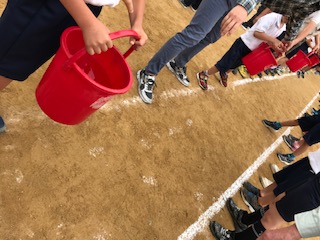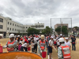 全員が力を合わせたバケツリレー。楽しみながら、しっかり体験学習ができました。大人と子どもが協力して、大きな力になることを実感。みなさん、ありがとうございました。
