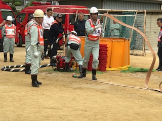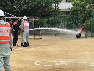最後に、可搬式ポンプ消火訓練の見学。はじめはペタンコの長いホースに水が送られると、ホースが膨らみます。歓声をあげる子どもも見られました。大きな水圧と水量で、的も見事にたおれました。防災班のみなさん、おつかれさまでした。たくさんの方々に感謝の気持ちを改めて感じた土曜授業です。