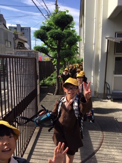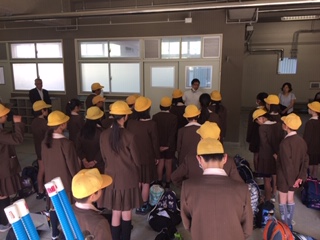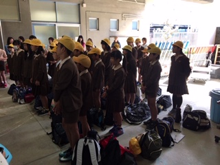 ピロティ—にて出発式。校長先生からHIROSIMAへ行く意味を考えようというお話があり、青山先生から諸注意を聞き、いざ出発。
