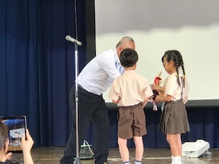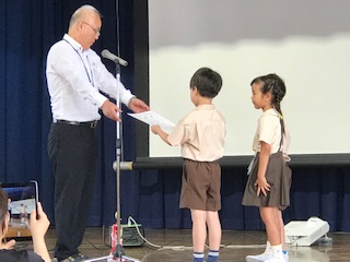 昨年度から始まった、校長先生からのガッツ賞。今年度もスタートです。第1回めは1年に受賞です。代表の児童に渡されました。4月から、いろいろ初めての事によくがんばりました。