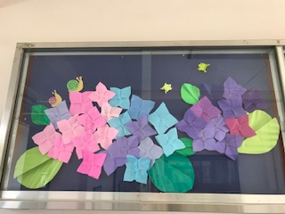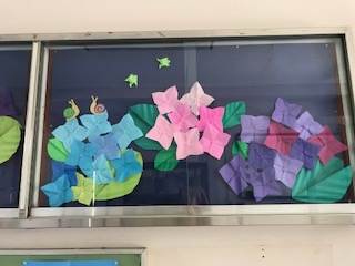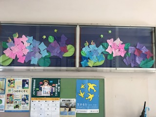 玄関に、華やかな紫陽花で彩られました。5年の作品です。梅雨も晴れやかな気分ですごせそうですね。