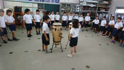 今日は、しあわせなら手をたたこうの歌にあわせて、コンガという楽器をたたきました。