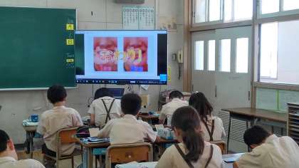 5年生は歯肉炎について学習し、歯ぐきがだすサインの色、形、かたさ、出血について自分の歯ぐきを観察しました。白くねばねばしたものはしこう、プラークでウヨウヨ動く映像をみてびっくりしていました。歯みがきの3つのポイントを教えてもらい磨く練習もしました。1、歯ブラシの毛先をきちんとあてる。2、小さくうごかす。3、軽くみがくです。歯ぐきの健康を保つために歯医者さんに行くことも大切です。これからも歯みがきをやりきって夢や目標に向かってがんばってほしいですね。