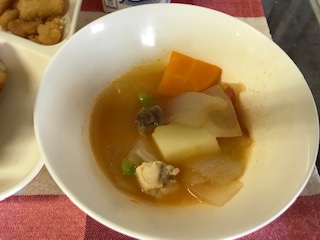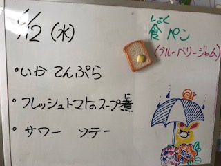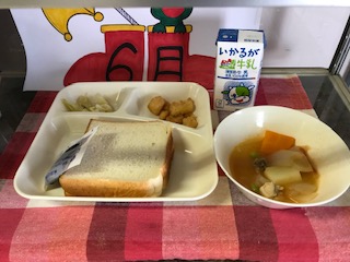 今日のメニューは、トマトのスープ煮です。トマトピューレは使わず、トマトの皮を朝から調理員がむいて、手作りのペーストで調理されています。あっさりとした中に、トマトの自然な香りが漂い、優しい味になっています。イカのフライ、ころもがサクサクしてスナック感覚で、子ども達に大人気でした。