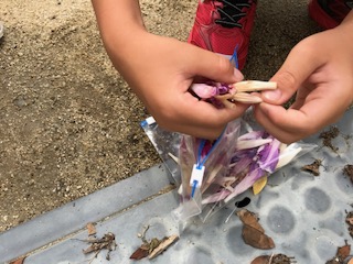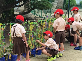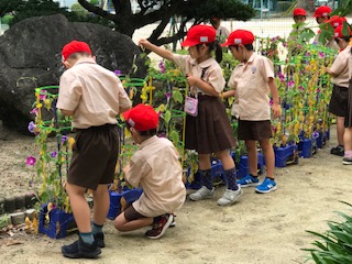 1年が育てている、アサガオの花がたくさん咲いています。花びらから、汁をつくり染めるそうです。どんな作品ができるのか、とても、楽しみですね。