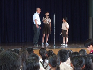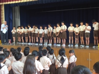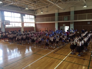 今朝の児童朝会は、明日の交流会へ向けて、中国語と演奏する「さんぽ」の合奏・ダンス練習でした。社明パレードで演奏した時のことを思い出しながら上手に演奏することができました。ダンスも元気よく踊れました。