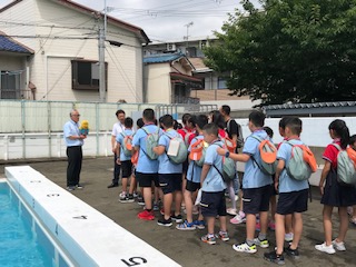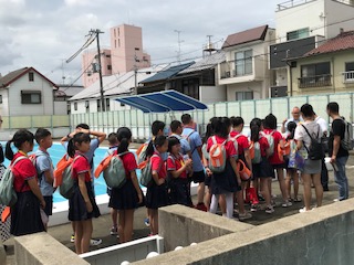中国四川省からの4年生訪問団を迎えました。まず最初に、日本の学校プールを見学です。校長先生の案内、通訳の方を介して内容を伝えています。おはようございます、と笑顔で日本語の挨拶をしてくれました。今から、子ども達との国際交流が始まります。
