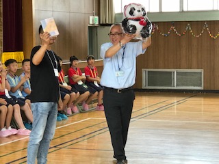 学校同士でプレゼント交換です。ぱんだのぬいぐるみを見て、みんなよろこんでいました。こちらからは、記念のフォトフレームを贈りました。