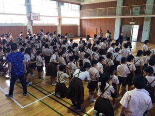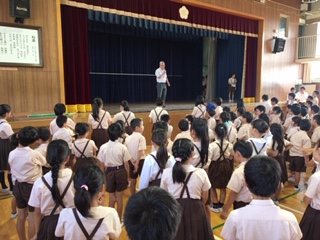 ゲーム終了後、校長先生から昨日の交流会についてのお話がありました。とても喜んで帰って行かれたと聞き、みんな大変満足そうでした。準備から片付けまで、よくがんばりました。